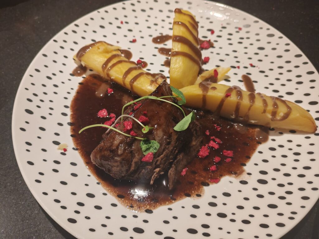 Pripremili smo par specijaliteta našim dragim gostima. Roast beef, sudeći po reakcijama, prisutnih bio je odličan početak večeri. Domaća juha od rajčice bila je toplo predjelo. Uslijedio je pravi specijalitet, goveđe obrazine koje uvijek ugodno iznenade naše goste. Uz njih je teran demiglas sa sečuanskim paprom i dehidriranom maslinom, a prilog je bio krumpir s teriyaki umakom.